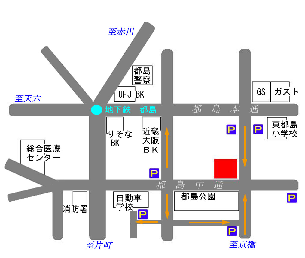 は、矢印方向に一方通行の道です。何も表示されていない道は、対面通行。